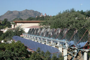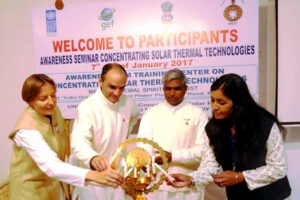 In 2014 an “Awareness & Training Centre” was set up by Brahma Kumaris & WRST with financial support from the United Nations Development Program, Global Environment Facility and the Ministry of New and Renewable Energy (Govt. of India). Brahma Kumaris has developed and installed 6 large solar systems which produce steam for various process applications such as cooking, laundry and sterilisation. In addition it has installed and operates around 350 photovoltaic battery systems (off grid) all over India with a total capacity of more than 1200 KW peak. In 2017 “India One”, a 1 MW solar thermal power plant near the Brahma Kumaris Shantivan campus in Abu Road was commissioned. Brahma Kumaris & WRST are currently conducting research and training in the following technologies: